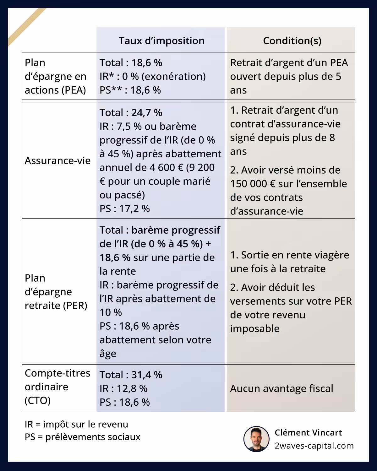 | 1 | Plan d’épargne en actions (PEA) | Total : 18,6 % IR* : 0 % (exonération) PS** : 18,6 % | Retrait d’argent d’un PEA ouvert depuis plus de 5 ans |